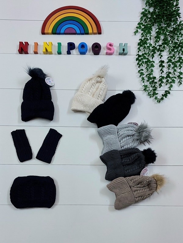 ست سه تیکه کلاه داخل خز گوش دار دارای پوم، شال رینگی داخل خز، دستکش فینگردار